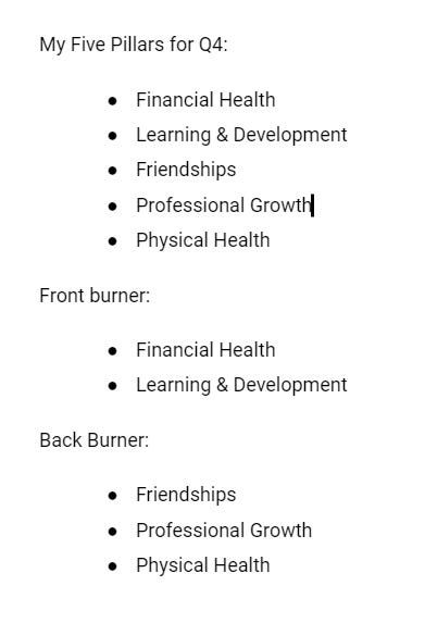 Choose five value pillars for the quarter and put two on the front burner and three on the back burner