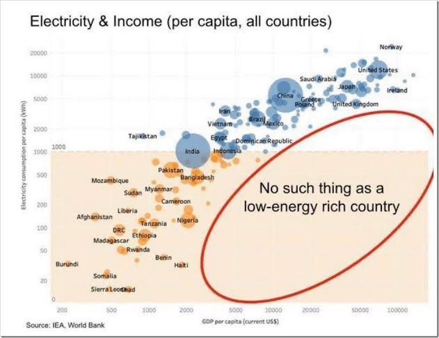 Consider the following chart. There is truly no such thing that exists in the world today as a low energy, low growth, high standard of living country. Quality of life is directly correlated to energy consumption and growth.