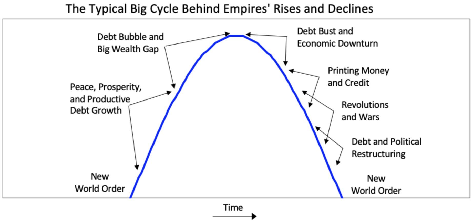 The world system is cyclical, and if you look at the following chart, you’ll see that we are right near the inflection point; somewhere between “big wealth gap” and “printing money / revolution and wars”.